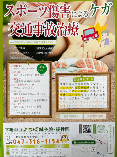 「下総中山よつば鍼灸院・接骨院」が新たに開院し、これまで以上に体のケアが身近になりました。