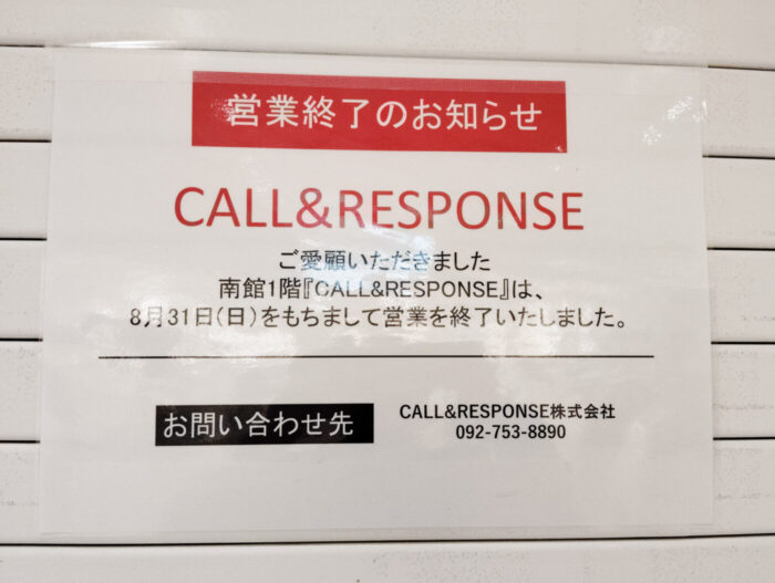 CALL&RESPONSE ららぽーとTOKYO-BAY店が8月31日で閉店、4月オープンから約4か月の営業