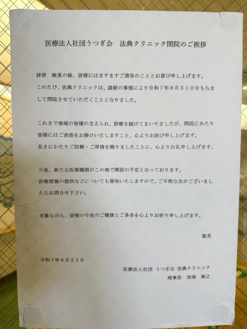 医療法人社団うつぎ会が運営していた法典クリニックは、令和7年8月31日をもって閉院となりました。