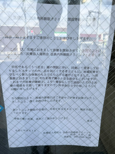 長年地域医療を支えてきた法典クリニックが8月31日をもって閉院し、9月8日から新たに「法典内科睡眠クリニック」として診療を開始しています。