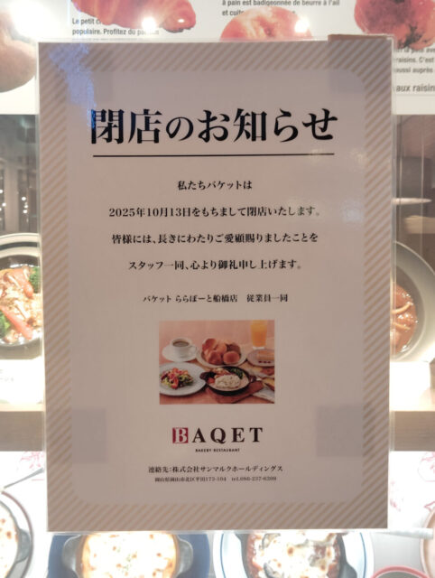 ららぽーとTOKYO‐BAY北館3階、パン食べ放題のベーカリーレストラン「BAQET(バケット)」が10/13(月)をもって閉店される事が分かりました。