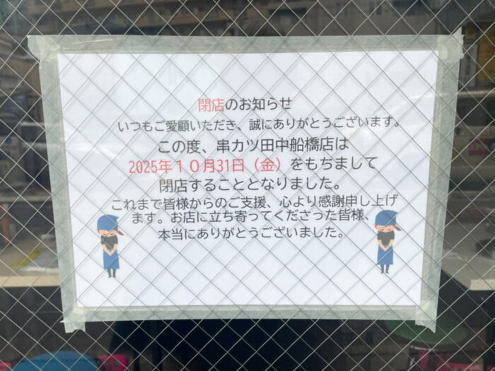 「ソースの二度づけ禁止」でお馴染みの串カツ田中が、船橋エリアから姿を消すことになりました。