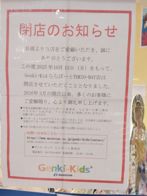 ららぽーとTOKYO-BAY北館2階で長年親しまれてきた子ども靴専門店「Genki-Kids(ゲンキ・キッズ) ららぽーとTOKYO-BAY店」が、2025年10月13日(月・祝)をもって閉店します。