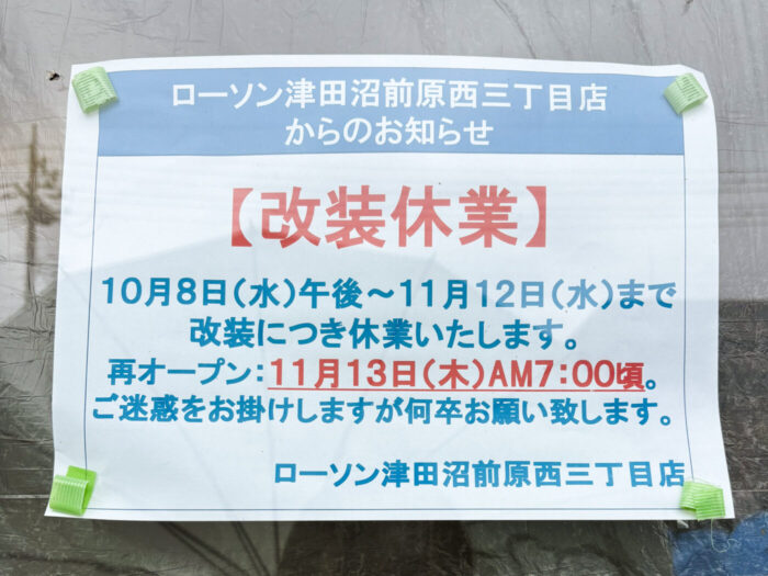 成田街道沿い「ローソン 津田沼前原西三丁目店」が改装のため10/8(水)〜11/12(水)まで休業中です。