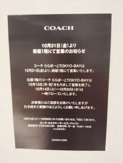 ららぽーとTOKYO‐BAY北館1階のハイブランド「COACH(コーチ)」が南館に10/31(金)移転予定である事が分かりました。