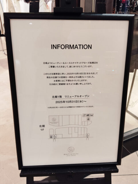 ららぽーとTOKYO‐BAY南館2階のアパレルショップ「BEAUTY & YOUTH」が10/19(日)をもって現店舗での営業を終了。