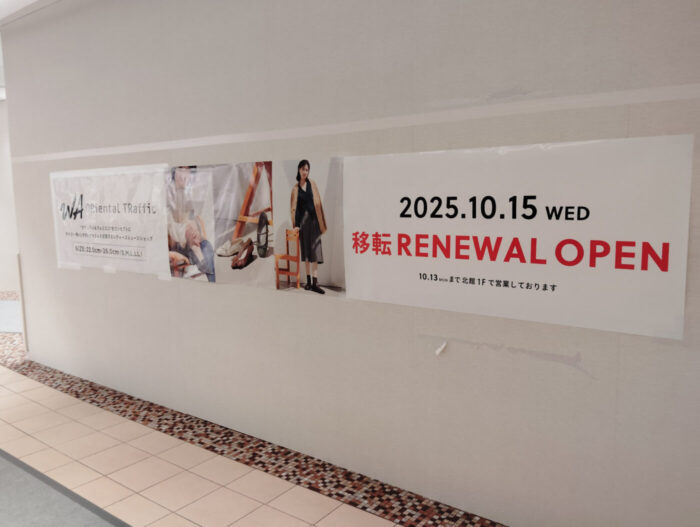 ららぽーとTOKYO‐BAY北館1階のレディースシューズ「WA ORiental TRaffic」ですが、10/13(月)に営業を終了しましたが、間髪を入れず、10/15(水)に南館2階に移転オープンしました。