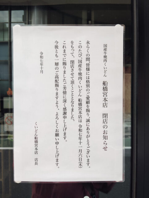 焼肉食べ放題専門店「国産牛焼肉くいどん 船橋宮本店」が2025年11月6日(木)をもって閉店することになりました。