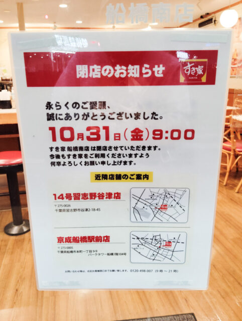 商業施設の大規模リニューアルが進む中、近くの「すき家南船橋店」が10月31日(木)午前9時をもって閉店することがわかりました。