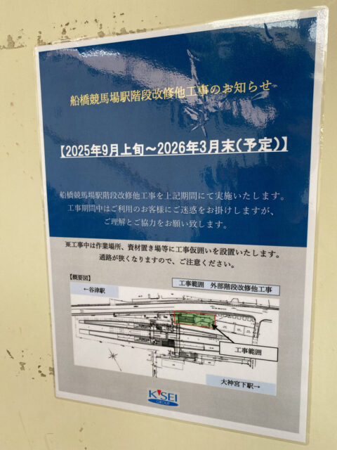 船橋競馬場駅では、2025年9月上旬から2026年3月末(予定)までの期間、階段改修他工事が実施されています。工事は京成建設が担当しており、外部階段と内部の改修が進められています。
