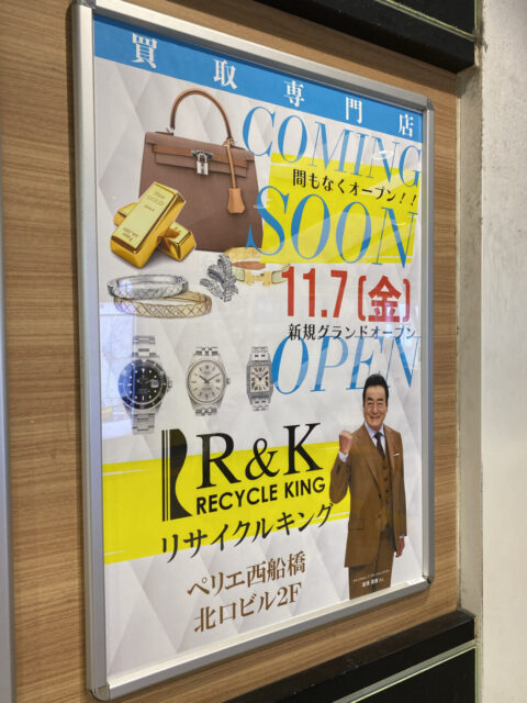 11月7日(金)、JR西船橋駅北口駅ビル改札外「ペリエ西船橋」2階に買取専門店「リサイクルキング ペリエ西船橋店」がオープンしました。