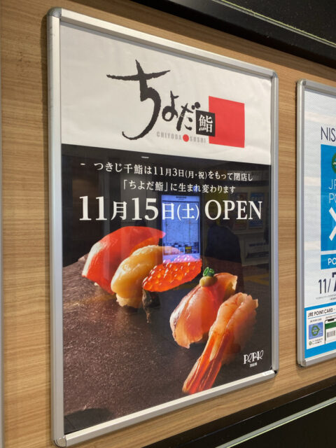 ペリエ西船橋にある「つきじ千鮨」が、11月15日(土)より「ちよだ鮨」として店名を変更してリニューアルオープンします。
