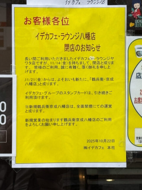 関連リンク:京成八幡駅「イデカフェラウンジ 八幡店」が11/14(金)をもって閉店