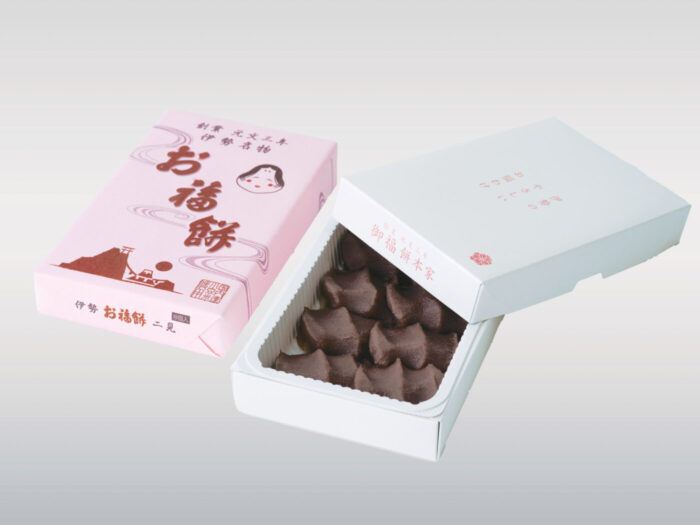 夫婦岩で有名な二見浦に位置する御福餅本家は、二見興玉神社の天の岩屋に祀られているアマノウズメノミコト(天鈿女命)から「お福餅」という名を得ており、パッケージには二見の夫婦岩が描かれています。