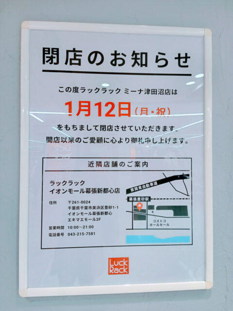 ミーナ津田沼3階のオフプライスストア「Luck・Rack(ラックラック)」が1/12(月)をもって閉店