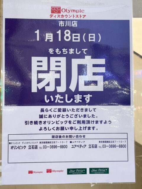 市川駅近くのディスカウントストア「オリンピック 市川店」が1/18(日)をもって閉店する事が分かりました。