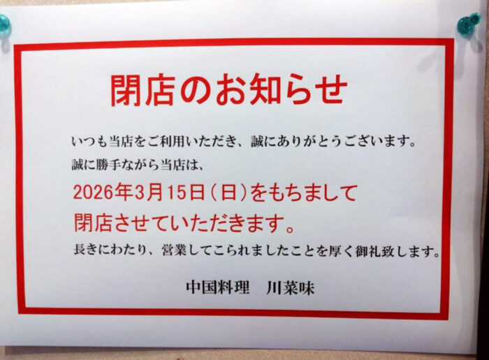 千葉県船橋市本町2丁目10-29にある「中国料理 川菜味(かわなみ)」が、2026年3月15日(日)をもって閉店することが12月7日に発表されました。