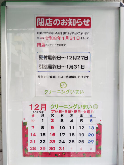 閉店告知によると、クリーニングの受付最終日は2025年12月27日、引渡し最終日は2026年1月31日となっています。