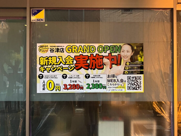 現在店舗前には「GRAND OPEN 新規入会キャンペーン実施中!」のポスターが掲示されています。