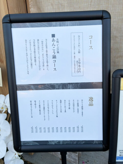 夜の営業(17:00〜23:30)では、本格的なコース料理を提供しています。「名物どぶ汁風あんこう鍋コース」は、生の肝がたっぷり入った濃厚なお鍋となっています。