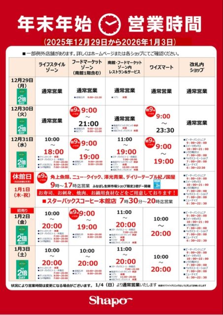 関連リンク:シャポー船橋 年末年始の営業時間のご案内