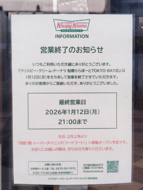 ららぽーとTOKYO-BAYでおなじみの「クリスピー・クリーム・ドーナツ」が、1月12日をもって閉店となります。