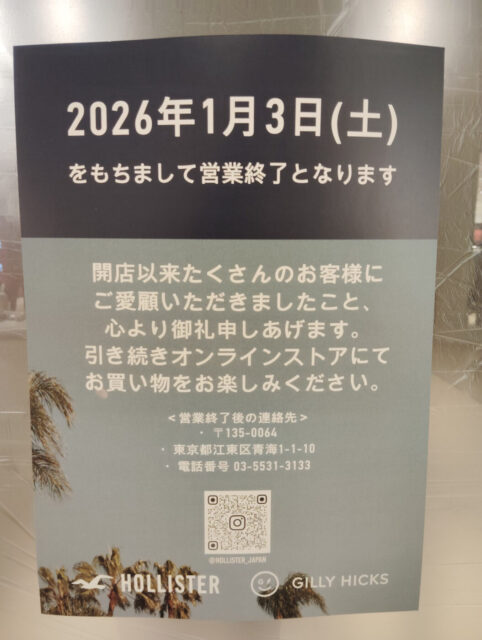 ららぽーとTOKYO-BAY「HOLLISTER」が1/3(土)で閉店、若者に人気のカジュアルブランド