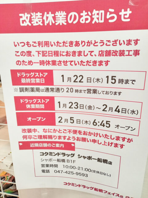 休業期間は1/23(金)〜2/4(水)までとなり、2/5(木)6時45分リニューアルオープン予定となっています。
