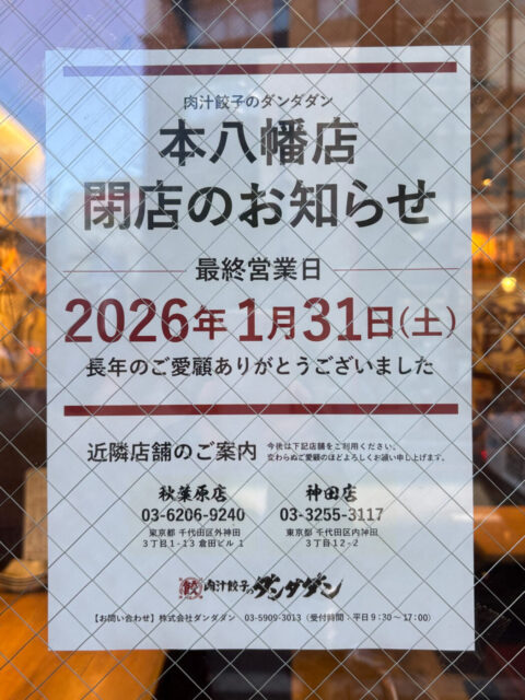 本八幡で営業している「肉汁餃子のダンダダン 本八幡店」が、2026年1月31日(土)をもって閉店することが発表されました。