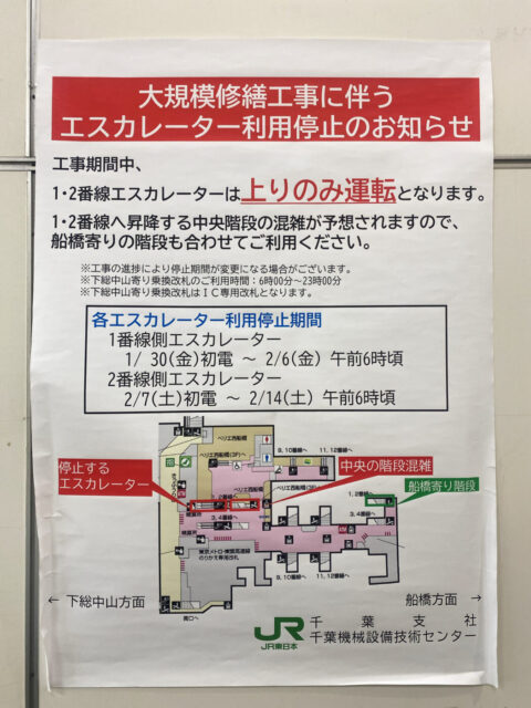 JR西船橋駅の1・2番線のエスカレーターの利用が一時停止、上りのみの運転に