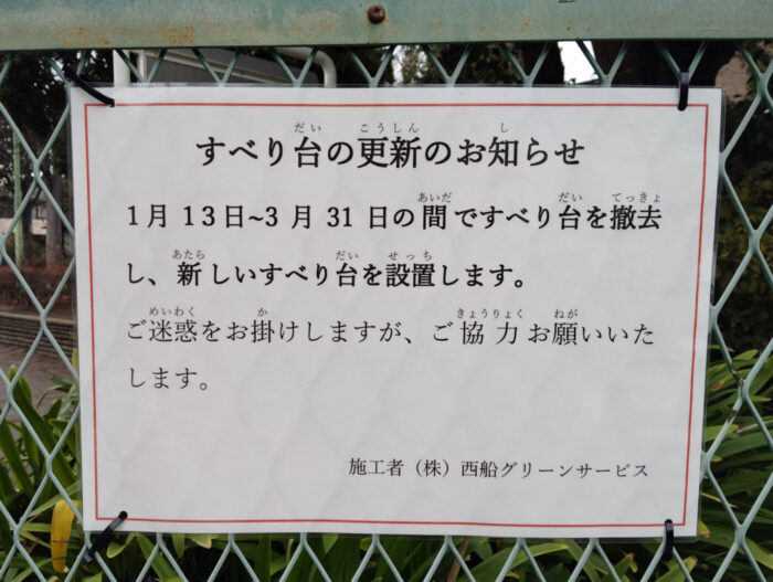 ただ現状のすべり台は立入禁止になっているわけではないので、故障が原因ではなさそうです。