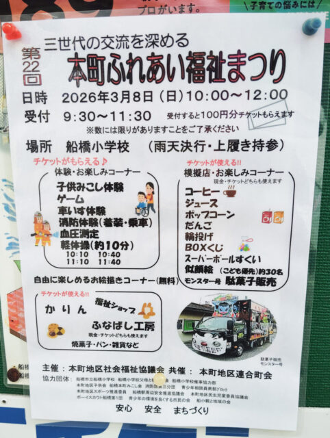 3/8(日)船橋小学校にて「第22回 本町ふれあい福祉まつり」が開催、体験・模擬店など【2026】