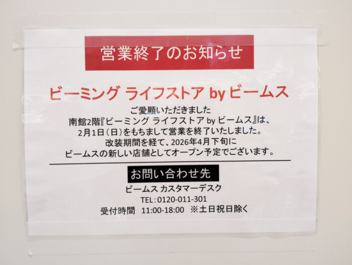 一時的に閉店してしまうのは残念ですが、4月には新しいビームスブランドの店舗として生まれ変わるということなので、どのような業態になるのか楽しみですね。