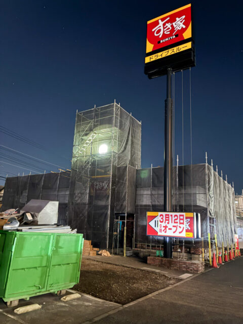 坪井東1丁目の牛丼チェーン「すき家 船橋日大前店」が2/16(月)から休業中、3/12(木)9時リニューアルオープン予定