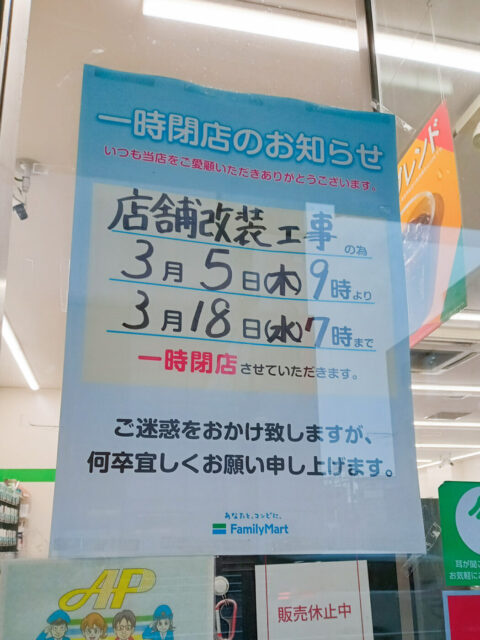 津田沼駅北口前のコンビニ「ファミリーマート 津田沼駅北口店」が3/5(木)9時から休業、3/18(水)7時からリニューアルオープン予定