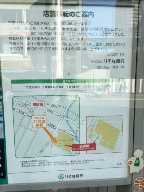 りそな銀行市川支店が本八幡駅前再開発事業に伴い、2026年11月頃にニッケコルトンプラザ内に仮店舗として移転する予定です。