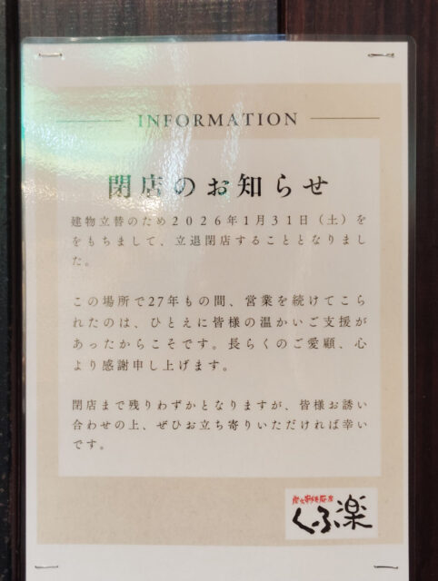 本八幡駅北口から徒歩約3分、八幡一番街商店会内で営業していた「炭火串焼厨房 くふ楽 本八幡店」が、2026年1月31日(土)をもって建物立替えによる立ち退きのため閉店となりました。