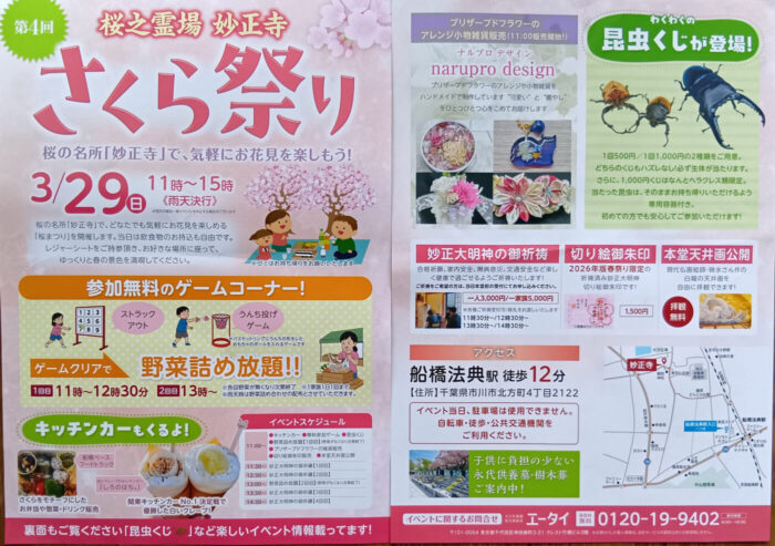 3/29(日)市川市北方町の妙正寺で「第4回 妙正寺さくら祭り」開催、新たなイベントも登場、境内でお花見も楽しめる