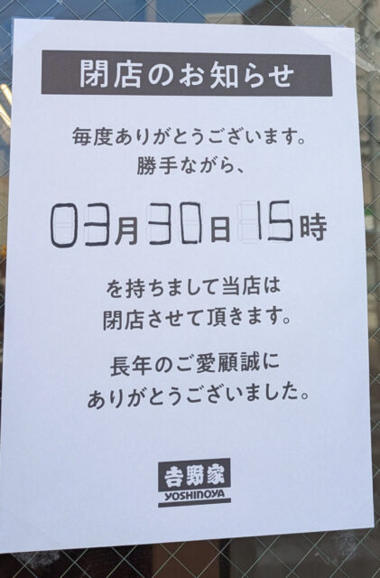 牛丼チェーン「吉野家 西船橋店」が3月末をもって閉店する事が分かりました。