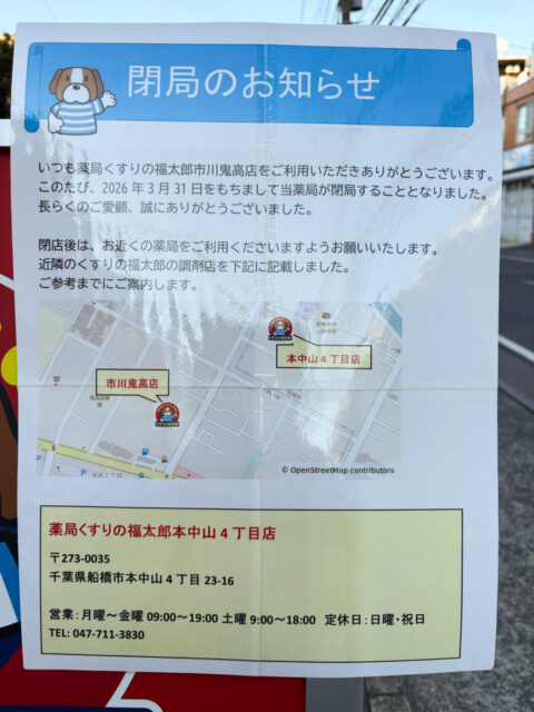 ドラッグストア「くすりの福太郎 市川鬼高店」調剤薬局のみが3/31(火)をもって閉店