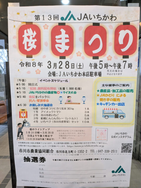3/28(土)市川市のJAいちかわ本店駐車場で「第13回JAいちかわ桜まつり」開催、桜餅無料配布や尺八・琴演奏会、お楽しみ大抽選会も