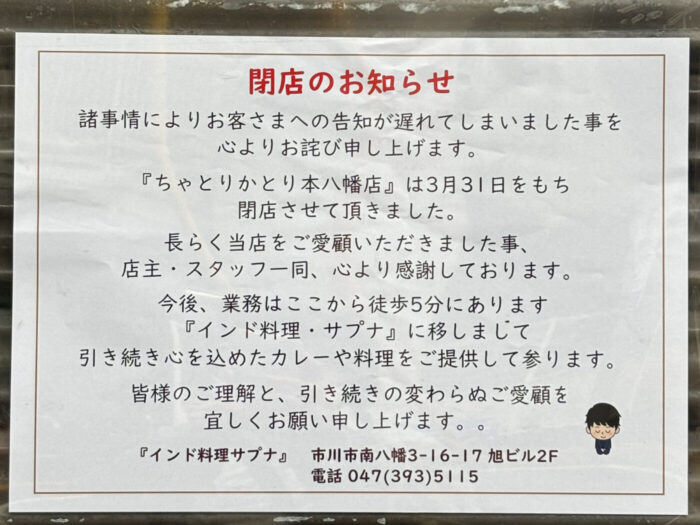本八幡駅南口から徒歩2分のインド・ネパール料理店「ちゃとりかとり」が、3月31日をもって閉店したことが分かりました。