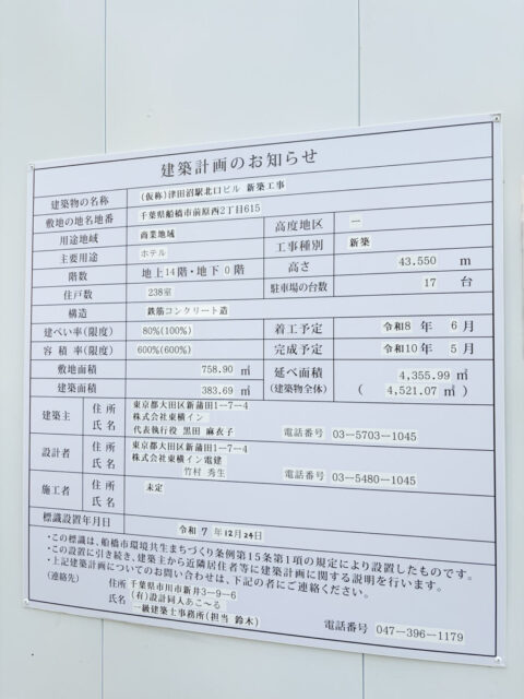 JR津田沼駅北口で、閉店し解体された「東横イン津田沼駅北口」ですが、建替えにより復活する事が分かりました。