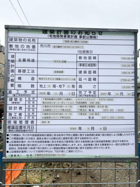 本八幡駅南口「八幡地区 第5駐輪場」となりにホテルの建設計画が掲示されているのを確認しました。