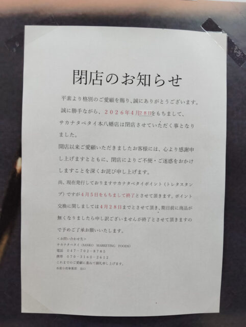 本八幡駅近く、MEGAドン・キホーテ地下1階の鮮魚店「サカナタベタイ」が4/28(火)をもって閉店する事が分かりました。